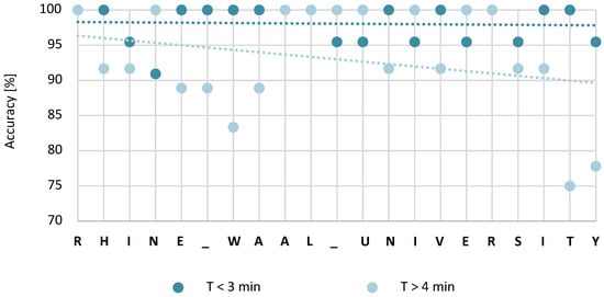 Despite this, 21.87% of the participants were not successful with the eye tracker. Other factors prevented reliable control as well; for example, participant related eye physiology (e.g., narrow eyes) tended to worsen trackability as also observed by Bilignaut and Wium []. The Midas touch problem seemed not to be an issue for most participants. Other researchers observed variability among participants in eye tracking performance as well. Räihä and Ovaska also discussed long term use performance []. They observed that during a one hour test run with an eye typing system, some participants were unable to complete the experiment due to eye fatigue, while other participants were not affected at all. The authors further listed reasons why eye fatigue may arise: poor calibration, participants frustration, system settings, mental demand, experimental conditions (e.g., temporal demand); also, the use of infrared light over longer time periods may cause discomfort, frustration and dryness of the eye. Eye fatigue can also be an issue with SSVEP-based BCIs (see e.g., []). Here, a slightly diminishing accuracy for slow performers was observed (see Figure 7. Apart from fatigue, higher stimulation frequencies towards the end of the phrase could explain the drop.