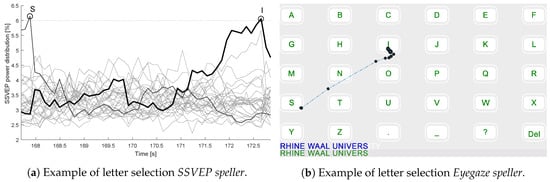 Comparison of the the steady-state visual evoked potentials based application (SSVEP speller) and the eye tracking based application (Eyegaze speller) during selection of the letter “I” in the example of subject 1. (a) The SSVEP power estimations are displayed as a function of time. The black line represents the SSVEP power of the frequency corresponding to the letter “I”. If a certain threshold value (in this case 6) was surpassed, an output command was classified; (b) Eye-movement path from the letter “S” to “I”. When the eye focused sufficiently long (1 s) on the desired box, the letter was selected. Before selection, the eye tracker recorded several gaze positions along the path from “S” to “I”.