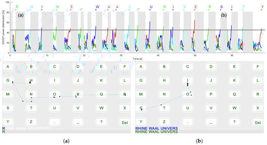 The entire spelling performance for the Hybrid in the example of subject 5. The steady-state visual evoked potentials power estimations are displayed as a function of time; the grey boxes represent the eye tracking phases. Eye tracking paths from (a) “R” to “H” and (b) “S” to “I” are provided.