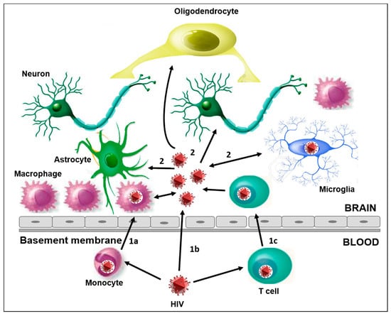 The main characteristics of HIV infection into the CNS. (1) The different ways of HIV-1 entry in the CNS: (1a) the “Trojan horse” mechanism, through HIV-1 infected monocytes that cross the BBB and differentiate into perivascular macrophage; (1b) direct entry, possible in the case of increased permeability due to dysfunctions and/or altered tissue; (1c) the migration into the brain of HIV-1 infected CD4+ T cells. (2) CNS resident cells susceptible to HIV-1 infection are microglia, neurons, astrocytes, and oligodendrocytes. The activation of these cells plays a key role in the release of proinflammatory cytokines, and can amplify the alteration and permeability of the BBB, thus promoting the neuroinvasion of HIV and other viruses.