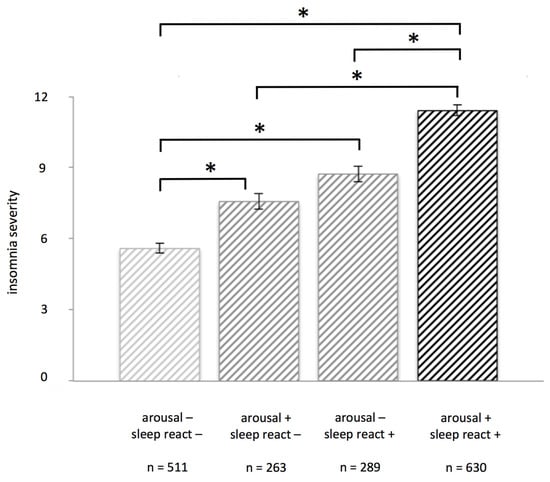 Medians for both arousal (APS, median = 30) and sleep reactivity (FIRST, median = 22) were first calculated. Defining high and low arousal and sleep reactivity groups based on these values is in line with previously published high arousal and high sleep reactivity values, and with those defined in the original test definitions [,]. Participants with high arousal scores (APS, n = 893) had significantly higher scores on the insomnia severity index (ISI: Mean = 10.29, SD = 5.81) than participants with low arousal scores (n = 800, Mean = 6.72, SD = 5.12) (F1, 1691 = 175.138, p < 0.001). Likewise, participants with high reactivity scores (n = 919) reported significantly higher insomnia severity (Mean = 10.57, SD = 5.68) than those with low sleep reactivity (n = 774; Mean = 6.27, SD = 5.05) (F1, 1691 = 267.523, p < 0.001).