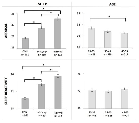 Next, we investigated the age effect on sleep reactivity and arousal. Baseline data were examined across three different age groups: 25–35 year olds, 35–45 year olds, and 45–55 year olds. In parallel and across age, the group was divided into three different sleep groups based on a previously described algorithm []: good sleepers, those with insomnia symptoms, and those with insomnia syndrome. The algorithm considers criteria of the Diagnostic and Statistical Manual of Mental Disorders, 4th Edition (DSM-IV []) and International Classification of Diseases, 10th Edition []) as well as sleep-promoting medication use and scores on the ISI and Pittsburgh Sleep Quality Index []. Responses from the Insomnia Severity Index [] the Pittsburgh Sleep Quality Index [], and from questions about the use of sleep medication were used to evaluate the presence or absence of each criterion. Participants in the group with an insomnia syndrome met all diagnostic criteria for insomnia. They were dissatisfied or very dissatisfied (score of 3 or 4 on a scale of 0–4) with their sleep patterns and had symptoms of initial, middle, or late insomnia at least three nights per week for at least 1 month. Substantial distress or daytime impairment related to sleep difficulties was also reported by those individuals (score of 3 or 4 on a scale of 0–4). Participants were also classified in the insomnia syndrome group if they used prescribed sleep-promoting medication at least three nights per week. Although not a formal criterion for insomnia diagnosis, use of sleep medication may mask the underlying symptoms. Participants classified in the group with insomnia symptoms reported initial, middle, or late insomnia at least three nights per week without fulfilling all diagnostic criteria for insomnia syndrome (i.e., they could report being satisfied with their sleep, not report distress or daytime consequences, or not meet the criterion of symptoms for at least 1 month required for a diagnosis of insomnia). This group also included individuals dissatisfied with their sleep but without symptoms of initial, middle, or late insomnia. Participants using prescribed sleep medication fewer than three nights per week or over-the-counter medication for sleep at least one night per week were classified in this group. Participants in the good sleepers group were satisfied with their sleep (i.e., score of 0–2 on a scale of 0–4) did not report symptoms of insomnia, and did not use prescribed or over-the-counter medication to promote sleep.