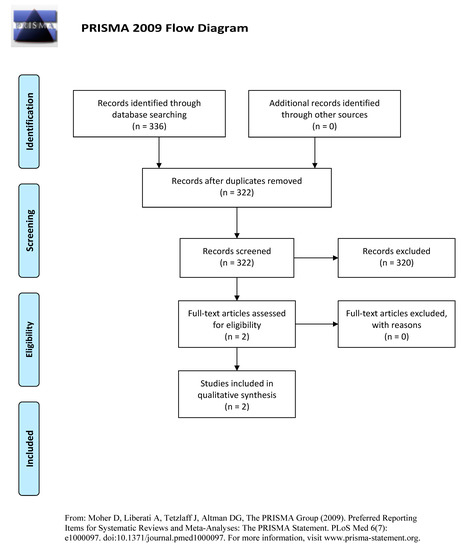 - Moher, D.; Liberati, A.; Tetzlaff, J.; Altman, D.G.; The PRISMA Group. Preferred Reporting Items for Systematic Reviews and Meta-Analyses: The PRISMA Statement. Ann. Intern. Med. 2009, 151, 264–269. [Google Scholar] [CrossRef] [PubMed]