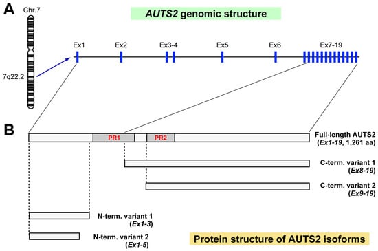 The AUTS2 gene (also recently named as the “activator of transcription and developmental regulator” by the HUGO Gene Nomenclature Committee (HGNC), #14262) located on chromosome 7q11.22, was initially linked with ASDs in a study by Sultana et al., who reported that the AUTS2 gene locus was disrupted by a de novo balanced translocation in two monozygotic twins with ASDs []. Extensive clinical genomic analyses have subsequently identified more than 50 additional patients with AUTS2 mutations, who presented similarly, but with high variability in the severity and combination of phenotypes of not only the autistic features, but also borderline to mild intellectual disabilities (IDs), microcephaly, feeding difficulties, short stature, hypotonia, and cerebral palsy as well as the dysmorphisms in craniofacial features [,,]. These common pathological features including ID, microcephaly and craniofacial abnormalities, except for the autistic features among the individuals with AUTS2 mutations, have been recently termed “AUTS2 syndrome” [,]. Moreover, the genomic structural variants and single nucleotide polymorphisms (SNPs) in the AUTS2 locus are also associated with a wide range of other neurological disorders such as epilepsy, schizophrenia, attention deficit hyperactivity disorder (ADHD), dyslexia and depression as well as addiction-related behaviors including drug addiction and alcohol consumption, implicating that AUTS2 is broadly involved in neurodevelopment [,,,,,,,,].