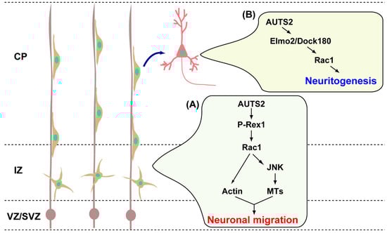 AUTS2-Rac signaling pathways in neuronal migration and neuritogenesis. (A) At the developing cerebral cortex, AUTS2 acts as an upstream factor for the P-Rex1-Rac1 signaling pathway to control the neuronal migration regulating the cytoskeletal rearrangements; (B) After completion of migration, AUTS2 activates Rac1 via the Elmo2/Dock180 complex and promotes the neurite extensions of cortical neurons. CP: cortical plate, IZ: intermediate zone, JNK: c-Jun N-terminal kinase, MTs: microtubules, VZ/SVZ: ventricular/subventricular zone.