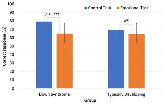 The results for the two experimental tasks (Figure 1) were analyzed with a mixed-design ANOVA with Group as the between-subjects variable (DS, TD) and Task as the within-subjects variable (control, emotional). There was no significant main effect of Group ((F(1,46) = 2.417, p = 0.127, ηp2 = 0.049)). A significant main effect of Task ((F(1,46) = 23.976, p = 0.001, ηp2 = 0.343)) was found but it was qualified by a significant Group x Task interaction ((F(1,46) = 5.047, p = 0.029, ηp2 = 0.099)). Post hoc comparisons did not reveal any intergroup differences, regardless of task, but intragroup comparisons showed that the DS group performed significantly better on the control task than the emotional task (p < 0.001, d = 1.15), whereas this was not the case for the TD group (p = 0.331).