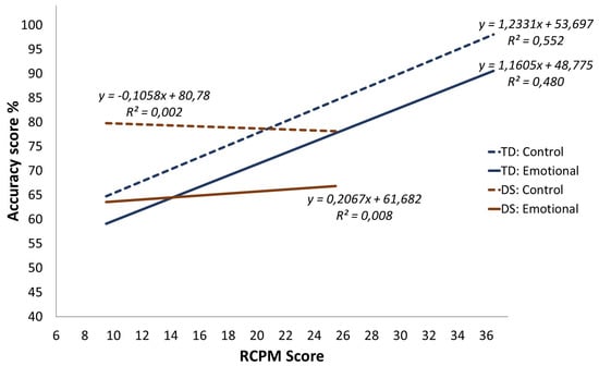 Regarding developmental trajectories, this study shows an unexpected development profile in adolescents with DS. Our results indicate that in this group, success on the RCPM is not a valid predictor of the nonverbal recognition of emotions, whereas it is a completely satisfactory predictor for TD children. Still, the RCPM [] was chosen as a preliminary measure of the nonverbal level based on the nonverbal nature of the experimental tasks recommended by Moore []. Also, and in addition to its ease of administration, the psychometric and developmental properties of the RCPM mean that it is widely used with both TD participants and those with a disorder [,]. Moreover, the lack of association between nonverbal reasoning and success on the experimental task was not specific to the processing of emotional information, since it was also observed for the control task. This finding was unexpected since Facon and Nuchadee [] found the same pattern of responses to the RCPM items in children and adolescents with DS, compared to children and adolescents with ID of undifferentiated etiology and TD children. Consequently, it would be hard to claim that a specific kind of nonverbal reasoning is involved in the RCPM to explain the lack of correlation with success on nonverbal tasks in adolescents with DS.