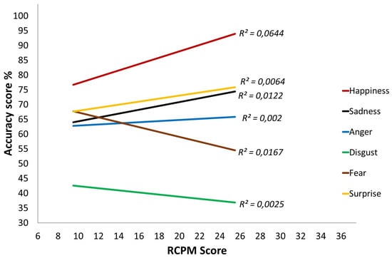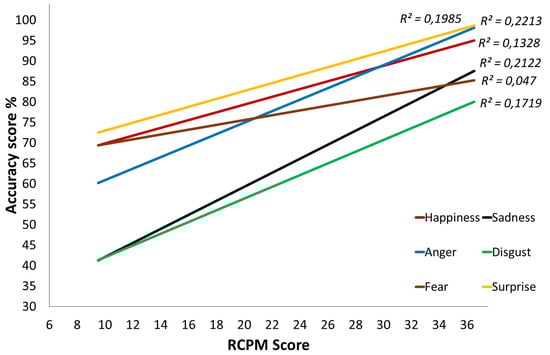 Cross-sectional developmental trajectories for the six basic emotions over Raven’s Colored Progressive Matrices (RCPM) scores, Typically Developing (TD) group.