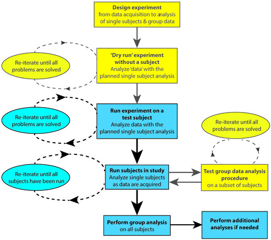 The test data should be analyzed using the full single-subject analysis pipeline. This procedure will allow any anomalies in experimental timing or issues related to the analysis pipeline itself to be identified and rectified. Following the correction of any errors in the data acquisition or analysis protocol, the dry run should be repeated until all errors have been eliminated prior to commencing actual data acquisition with subjects. Before starting to test subjects it is also advisable to run the experiment using a lab member as a test subject to iron out any additional issues in the protocol and data analysis pipeline from the real EEG/MEG data provided by the test subject. In addition, the group analysis procedures can be debugged and tested after data from a subset of the total subjects have been collected. A flowchart for testing and running a study is shown in Figure 1.
