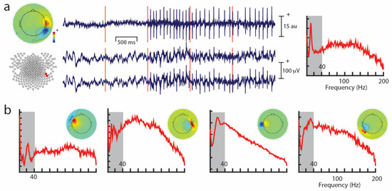 Muscle unit spiking artifact. (a) A topographic map from Independent Component Analysis (ICA, left panel, top) and the associated scalp EEG electrodes (bottom left, red circles) overlying a muscle unit. The muscle unit’s ICA time course (middle panel, Trace 1) and corresponding EEG data (Traces 2 and 3, with red vertical lines separating data epochs are shown). The spiking of the muscle unit appears in the third epoch and is seen above some residual muscle activity. The muscle unit’s spikes can be clearly seen in the EEG signal and coincide temporally with spikes in the ICA time courses. The associated logarithmic power spectrum (right panel) shows a prolonged tail of EMG activity out to 200 Hz, but also has a prominent peak in the EEG frequency range (0–40 Hz, gray shading) caused by the spiking of the muscle unit. a.u. = arbitrary units, µV = microvolts. (b) Examples of spatial distributions EMG ICA components with their associated power spectra. All show prolonged tails up to 200 Hz with different peaks, some of which clearly occur in the EEG/MEG frequency band (0–40-Hz range, gray shading) in all plots. Peaks in the alpha and beta ranges are caused by the spiking behavior of the muscle units.
