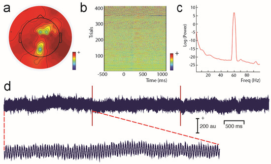 Line noise changes during an experiment. (a) Topographic distribution of 60-Hz line noise artifact in EEG data, as identified with an independent component analysis (ICA) map. The bizarre topography of the artifact reflects the likely difference in EEG electrode impedances across the head. The color scale depicts arbitrary units. (b) Compressed display of ICA time courses over the entire experiment shows an increase in the size of the artifact over time. Trials increment from bottom to top, and the artifact is more clearly seen as blue and red colors at the top of the display. The color scale depicts arbitrary units. (c) Power spectrum of the ICA component shows a clear peak at 60 Hz. (d) Time course of the ICA component across three epochs shows the “fuzzy” appearance of line noise that is typical in EEG recordings. The bottom trace shows an expanded version of the signal with a clear periodic form as a function of time.