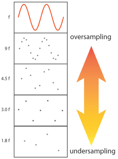 Effects of sampling rate on sampled data. A sinusoidal signal, f (top left), has been sampled at a number of different rates relative to its frequency. Progressively slower sampling reduces detail and signal quality. At frequencies above the Nyquist criterion of 2f, the frequency content of the signal can be seen (middle three traces). However, note that information has been lost in the bottom trace where the data have been sampled at 1.8f.