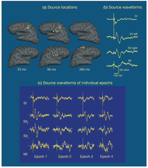 - Forss, N.; Hari, R.; Salmelin, R.; Ahonen, A.; Hamalainen, M.; Kajola, M.; Knuutila, J.; Simola, J. Activation of the human posterior parietal cortex by median nerve stimulation. Exp. Brain Res. 1994, 99, 309–315. [Google Scholar] [CrossRef] [PubMed]