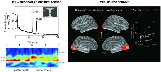 - Parkkonen, L.; Andersson, J.; Hämäläinen, M.; Hari, R. Early visual brain areas reflect the percept of an ambiguous scene. Proc. Natl. Acad. Sci. USA 2008, 105, 20500–20504. [Google Scholar] [CrossRef] [PubMed]