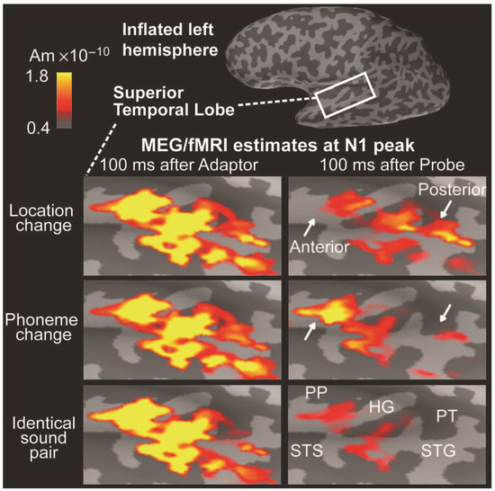 - Ahveninen, J.; Jaaskelainen, I.P.; Raij, T.; Bonmassar, G.; Devore, S.; Hamalainen, M.; Levanen, S.; Lin, F.H.; Sams, M.; Shinn-Cunningham, B.G.; et al. Task-modulated “what” and “where” pathways in human auditory cortex. Proc. Natl. Acad. Sci. USA 2006, 103, 14608–14613. [Google Scholar] [CrossRef] [PubMed]