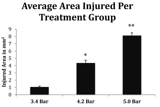 Quantitative measurements of the TBI injured area (mm2) from Han-Wistar rats (n = 10 for all treatments) subjected to acoustic wave treatments at 3.4, 4.2 and 5.0 bar. Quantification of the TBI infarct area was determined by the disruption of cells including the condensed dark cells which extend out to the periphery of the recovering border of the injury. The damaged cortical area surrounding the TBI was then traced by following the boundary of these peripheral cells. The infarct area was then quantified using SketchandCalcTM to measure the region of damage (mm2). An ANOVA showed statistical differences among the treatment groups (F = 134.9; p < 0.001, denoted * and **) in a dose-dependent manner. All values are means ± standard error.