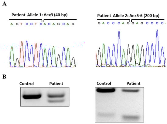 Panel (A) shows sequencing of patients’ cDNA generated by RT PCR with deletion in both alleles. Panel (B) shows confirmation of heterozygosity in each locus where a control subject has only wild type (normal) band in both analyzed loci; patients’ cDNA shows heterozygosity with wild type and smaller mutant bands. This was also previously published in a modified form as a part of Supplementary data, with the proband denoted “SM” and the younger brother denoted “PM” [18].