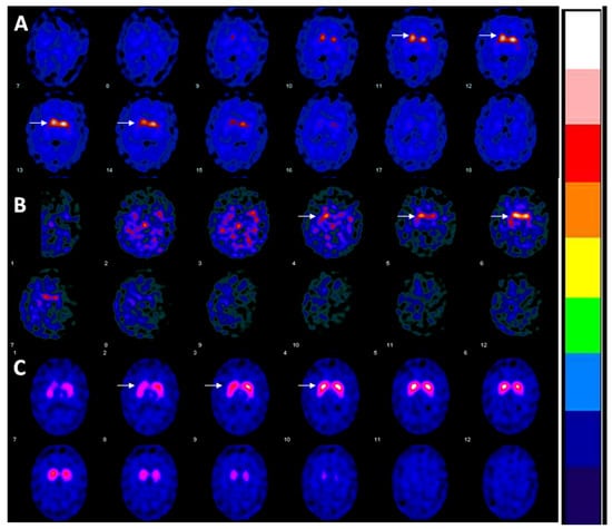 - Thobois, S.; Ribeiro, M.J.; Lohmann, E.; Durr, A.; Pollak, P.; Rascol, O.; Guillouet, S.; Chapoy, E.; Costes, N.; Agid, Y.; et al. Young-onset Parkinson disease with and without parkin gene mutations: A fluorodopa F 18 positron emission tomography study. Arch. Neurol. 2003, 60, 713–718. [Google Scholar] [CrossRef] [PubMed]