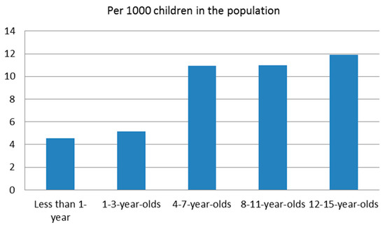 Descriptive and chi-square analyses revealed many differences between infants and the other four age groups (Table 2). The distribution of child characteristics, including sex and ethnicity are similar across the five different age groups (Table 2). The likelihood of a child welfare worker identifying a child functioning concern increased with age (Table 2 and Figure 2). Infants were significantly less likely to have a child functioning concern identified when compared to children who were early school-aged (4–7), pre-adolescent (8–11), and adolescent (12–15). Infants had the lowest incidence at a rate of 4.53 per 1000. In contrast, adolescents (12–15) had the highest incidence rate at 11.93 per 1000.