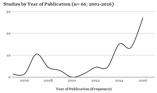 All articles were published between 2001 and 2017, with 39.46% of the studies (n = 27) published in 2016 and the first half of 2017 (Figure 1). Most of the studies were conducted in the United Kingdom (39.39%) and the United States (37.88%). Self- and proxy-report measures were the most commonly used assessment method (78.78% of all studies) (Figure 2).
