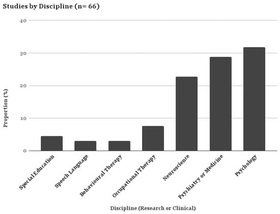 Generally the rationale or aims of the studies were either exploratory or measurement-based. The research disciplines of the first author were most often psychology or psychiatry (Figure 3). Exploratory studies aimed to understand (a) the nature of sensory symptoms in ASD; or (b) how sensory symptoms in ASD relate to other constructs (e.g., anxiety or ASD symptom severity) or physiological processes (e.g., proprioception, tactile discrimination, brain activity), while measurement studies aimed to describe the development and psychometric evidence for specific instruments. Four studies evaluated interventions (pharmacological, CBT, sensory integration, and behavioral intervention) and used a sensory processing assessment as an outcome measure.