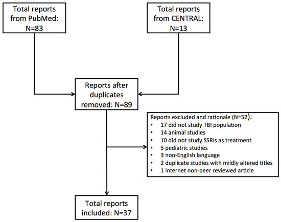 Of the 89 unique articles identified, 52 were removed due to lack of applicability to the current review (17 did not define TBI as the study population of interest, 14 were animal studies, 10 did not discuss SSRI as a treatment modality, five were pediatric studies, three were non-English language, two were repeated studies, and one was an internet article). A final total of 37 manuscripts (eight randomized-controlled trials (RCT), nine open-label studies, 11 case reports, nine review articles) were deemed fit for inclusion as part of the current review (Figure 1; Table 1).