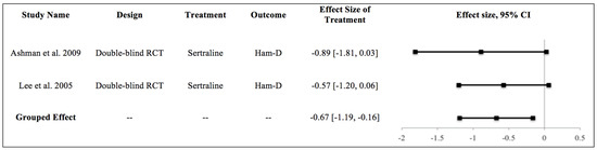 Meta-analysis of all double-blind, randomized controlled trials of sertraline versus placebo (n = 2), using the Hamilton Depression Rating Scale as the outcome. Effect sizes are reported for the treatment group (sertraline). CI, confidence interval; Ham-D, Hamilton Depression Rating Scale; RCT, randomized controlled trial.