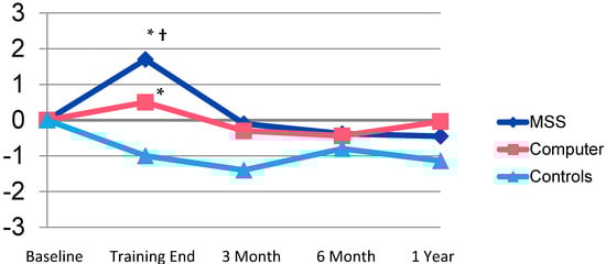 Change in Memory Activities of Daily Living Over Time. * p < 0.05 within-subject change. † p = 0.01 between-subject change for Memory Support System (MSS) compared to controls.