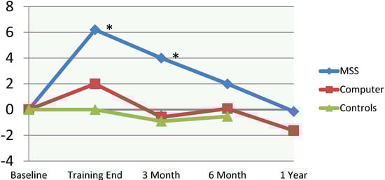 There were no significant differences at the end of training between the MSS and BF groups in functional status (as rated by mADLs) in this small pilot sample (F3, 51 = 1.1, p > 0.05). Within-subject mADLs were significantly improved at the end of training for MSS (t = 2.5, p < 0.05), but also improved with BF (t = 2.3, p < 0.05). There were no noteworthy differences or effect sizes in mADL status between the MSS, BF, or control groups at 3-, 6-, and 12-month follow-up points (Figure 1).