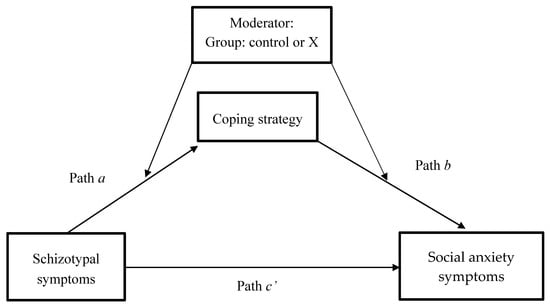To investigate mediating mechanisms, a moderated mediation analysis was conducted using the PROCESS macro from Hayes [32,33], model 58. In this model, social anxiety (total score) was entered as the outcome variable, schizotypal symptoms (total) as independent variable, and the three coping strategies as parallel mediators. Group was included as the moderator on the dependent variables coping strategy and social anxiety. Gender and IQ were included as covariates in this model. See Figure 1 for a representation of this model.