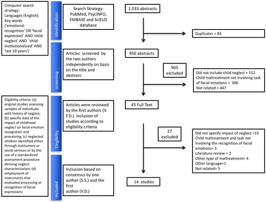 After initial selection, the first author (V.F.D.) reviewed the full text of selected articles and selected the articles according to the following electing criteria: (a) original studies assessing samples of individuals with history of neglect (i.e., not reviews, meta-analyses, editorials, or case studies); (b) specific data of the impact of childhood neglect on face recognition and processing (or data of neglected groups separately of other types of child maltreatments or patient groups); (c) neglected children identified either through institutions or social services or by the use of a standardized assessment procedure for neglect characterization; (d) research that used instruments with presentation of face images in the assessment of emotional recognition (accuracy in identification of facial expression) and face processing (neural or attentional bias aspects involved in face recognition). Studies without available data to estimate the impact of childhood neglect were excluded. All included articles were reviewed by the other author (S.S.).