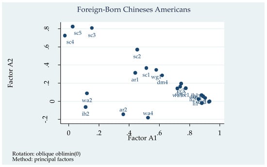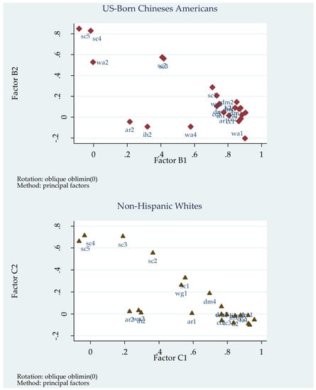 By comparing the patterns of the patterns in the three plots of factor loading in Figure 1, the author concludes that there are only minor differences in the factor structures of the three groups. The US-born Chinese Americans seem to present a more clustered factor loading pattern (red diamonds in the middle plot), which indicates a slightly tighter and clearer two-factor structure, especially Factor B1 (the clustered on the right end). One other notable variation is wa2, which loads strongly onto Factor B2 for US-born Chinese Americans, but does not load strongly onto any factor for the other two groups. Overall, the factor analysis shows factor structural similarity across the three groups.