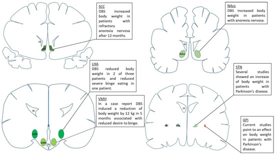 Several studies investigated the effects of DBS on body weight gain and food intake in rats [34,35,36,37,38], pigs [39], monkeys [40] and humans [31,32,33,41] under different conditions of chronically altered body weight (obesity and AN). Since various areas of the brain are known to be involved in the modulation of food intake [42], DBS might target different brain sites including the subcallosal cingulate (SCC) [33,41], the reward circuitry [34,35,36], internal globus pallidus (GPi) [43], hypothalamic areas [31,39,40], STN [44,45] or the rostromedial tegmental nucleus (RMTg) [46].