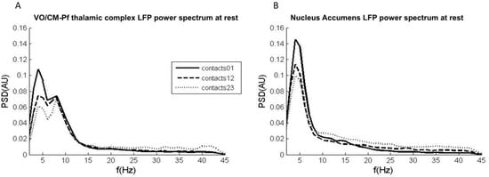 LFP power spectrum at rest obtained from the Vo/CM-Pf and NA nuclei. (A) Average power spectrum across all Vo/CM-Pf nuclei (n = 8) obtained from LFPs captured from contacts 0–1 (black solid line), 12 (dashed black line), and 23 (dashed grey line). The x-axis represents frequency (Hz) and the y-axis represents the normalized power spectral density (PSD, arbitrary units). (B) Average power spectrum across all NA nuclei (n = 4) obtained from LFPs captured from contacts 0–1, 1–2, and 2–3. The plot is organised as it is in panel A.