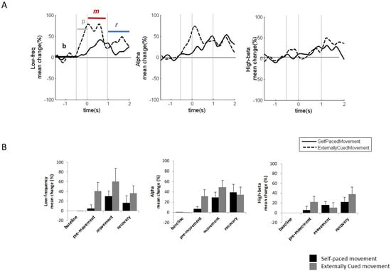 Vo/CM-Pf LFP power modulation during voluntary movements. (A) Grand average (n = 7) of the low-frequency (left plot), alpha (central plot), and high beta (right plot) power modulations during self-paced voluntary movements (solid black line) and externally-cued movements (dashed black line). Power modulations are expressed as percentage changes from the baseline phase and were estimated starting from 1.5 s before the movement onset until 2 s after the movement onset. The four movement-related phases were baseline (b), pre-movement (p), movement (m), and recovery (r). x-axis: time (s); y-axis: Hilbert-power modulations (Percentage). (B) The histograms represent the mean power modulation for low-frequency (left plot), alpha (central plot), and high beta (right plot) bands in the four movement phases (baseline, pre-movement, movement, and recovery) for self-paced movements (black bars) and externally-cued movements (grey bars). Error bars represent the standard error.