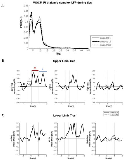Vo/CM-Pf LFP oscillations during involuntary movements in one patient. (A) Power spectrum of LFPs captured from the Vo/CM-Pf nucleus using contacts 0–1 (black solid line), 12 (dashed black line), and 23 (dashed grey line) during motor tics. The x-axis represents frequency (Hz) and the y-axis represents the normalized power spectral density (PSD, arbitrary unit). (B) LFP power modulations for the low-frequency, alpha, and high beta bands recorded during upper limb tics from the electrode contact pairs 0–1 and 1–2, averaged across all observed tics. Power modulations are expressed as percentage changes from the baseline phase and were estimated starting 1.5 s before the movement onset until 2 s after the movement onset. The four movement-related phases were baseline (b), pre-movement (p), movement (m), and recovery (r). X-axis: time (s); y-axis: Hilbert-power modulations (%). (C) LFP power modulations for the low-frequency, alpha, and high beta bands recorded during lower limb tics from electrode contact pairs 0–1 and 1–2, averaged across all observed tics. The plots are organised as they are in panel B.