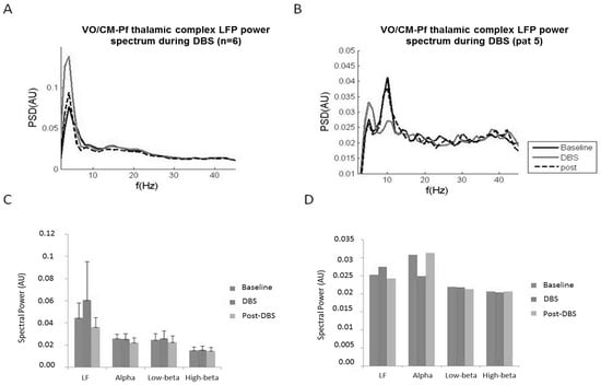 We observed that DBS modulates LFP oscillatory activity by specifically increasing low-frequency power from baseline. The other power frequencies remained unchanged. After DBS was turned off, LF power decreased and returned to the baseline LF power value (Figure 4A,C). In one patient (patient no. 5, Table 3), we also observed a decrease in the alpha band when DBS was turned on. The alpha band value returned to baseline after DBS was turned off (Figure 4B,D).