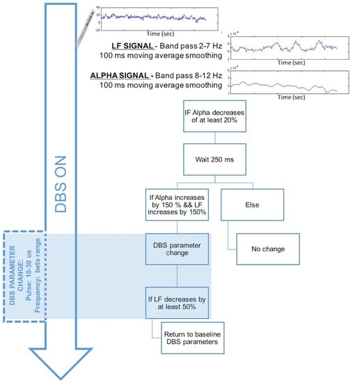 When a decrease in the alpha power of at least 20% lasting for at least 250 ms is detected, the system verifies whether it is followed by a 150% increase in both the alpha and LF signals. If this is the case, the DBS parameters are changed to decrease the LF signal and suppress the alpha changes. We hypothesize that a decrease in the pulse width to 10–30 μs and a decrease in the frequency around the high beta band (30–35 Hz) would help stop involuntary movements and decrease the LF and alpha band activities. When the LF band returns to a maximum of +50%, the DBS can be switched to the classical optimized parameters.