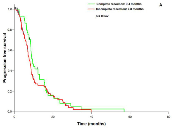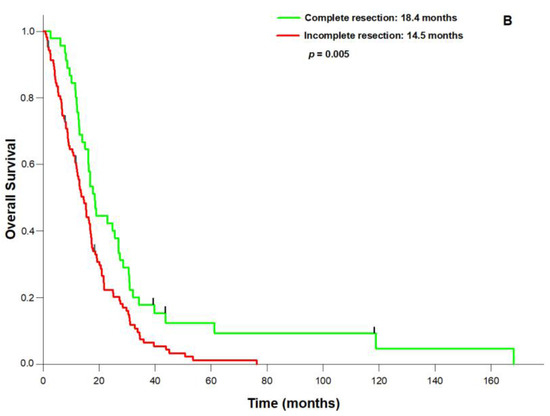 Resection status and outcome in patients with newly diagnosed GBM: (A): Progression-free survival is significantly longer after 100% resection than after <100% resection; (B): Complete resection also leads to significant overall survival benefit.