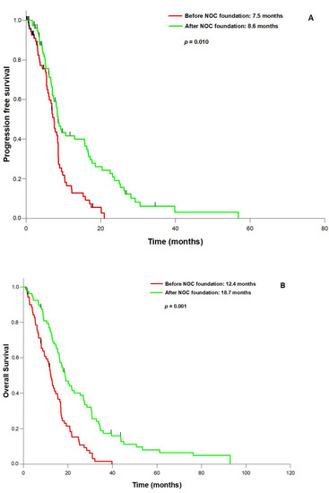 Outcome before and after the NOC foundation: (A): progression-free survival and (B): overall survival is significantly longer in the subcohort treated after the NOC foundation.