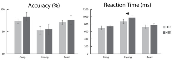 Lower accuracy and longer reaction times (RT) on INCONG trials confirm the Stroop interference effect. HED participants show longer RT time only on incongruent trials: * p < 0.05.