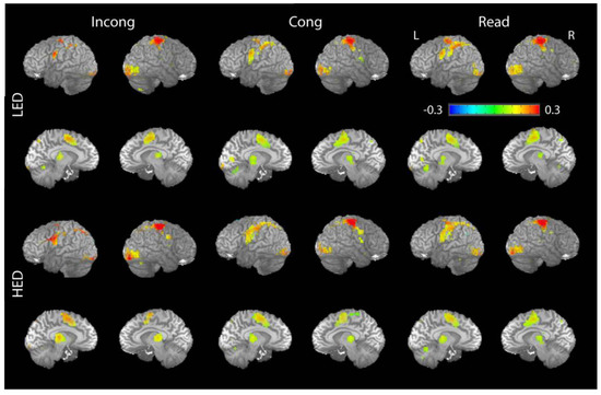 As shown in Figure 3, voxel-wise analysis of the peak activation showed a distributed activation pattern which is broadly consistent with previous studies. The task conditions activated inferior precentral, anterior ventrolateral prefrontal, sensorimotor, parietal, occipital cortices and the insula laterally, and the supplementary/presupplementary cortex and the thalamus medially. A robust main effect of Condition with stronger activation to INCONG compared to CONG and READ trials was observed across most association fronto-parietal activated areas but not in the precentral, sensorimotor, and visual cortices (Figure 4, Table 2). Extracted ROI time series were statistically assessed via mixed-model ANOVA and presented in percent signal change values (Figure 4, Table 2). The largest effects of Group were observed in the VLPFC and the thalamus bilaterally. INCONG trials elicited stronger activity in HED in both the VLPFC (F1,29 = 13.4, p < 0.001) and left thalamus (F1,29 = 5.3, p < 0.05) relative to LED (Figure 3 and Figure 4). Similar to the behavioral results there were no significant gender differences in the ROI analysis.