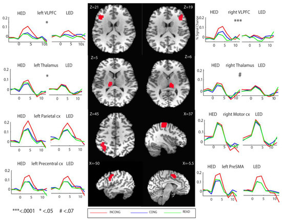 Group average time series expressed as % signal change of the blood oxygenated level dependent (BOLD) signal for the effects of Condition and Group. As shown in Table 2, greater BOLD contrast was observed in HEDs in ventrolateral prefrontal cortex (VLPFC) and the thalamus bilaterally. Response conflict evoked greater activity in the frontal and parietal association cortices overall, but only marginally in the thalamus and not in the sensorimotor cortex (*** <0.0001; * <0.05; # <0.07).