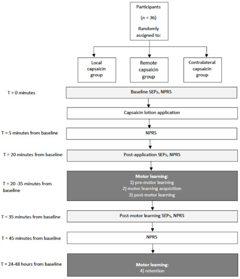 The impact of pain on the sensorimotor response to motor skill acquisition was assessed by recording early SEPs in humans and acute experimental pain was induced by applying capsaicin cream. The effect of acute pain and motor learning on signal transmission was assessed by investigating alterations in the amplitude of SEP peaks 20 min post-application, and then following the motor learning task (45 min from baseline) (see Figure 1 for a schematic of the protocol).