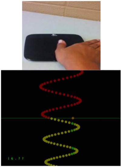 Photographs of the computer monitor showing one version of the motor tracing task performed by each participant task and a participant’s hand on the wireless touchpad that was used to perform the tracing task. The traces consist of a series of dots which the participant tracked when the trace passed a horizontal line. The orange dot shows the location of the participant’s cursor along the horizontal line. Motor performance error was calculated as the average distance that the cursor was from the “perfect” trace.