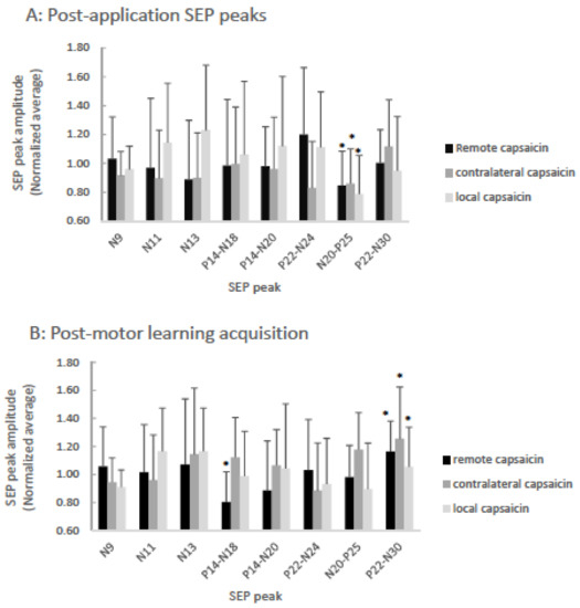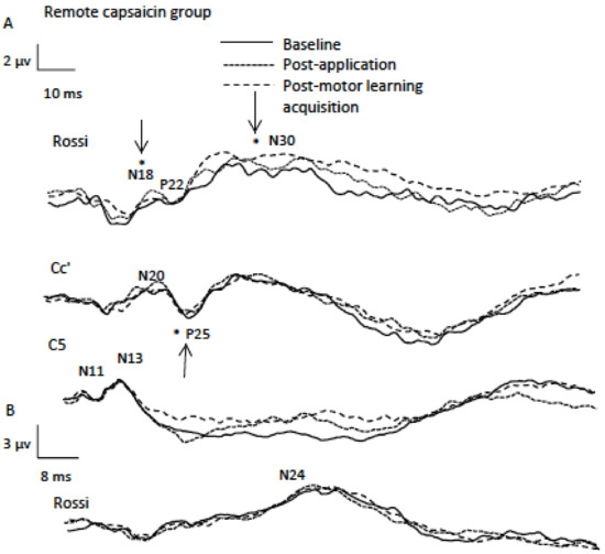 Data from a representational remote participant (average of 1000 traces) indicating SEP peaks including A (2.47 Hz) and B (4.98 Hz) sessions. Note the significant differences for the P25 SEP peak following capsaicin application and for the N18 and N30 SEP peaks following motor learning acquisition as indicated by asterisks.