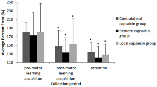 Bar graph depicting the percent error by group. The remote, local, and contralateral and capsaicin groups improved in accuracy following motor learning acquisition (p < 0.001) and at retention (p < 0.001) as indicated by asterisks. Error bars represent the standard deviation.