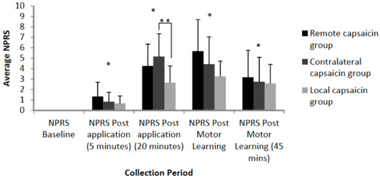 For the NPRS measurements, a repeated measures ANOVA with factors TIME [baseline, post-application (5 min), post-application (20 min), post-motor learning acquisition (35 min), post-motor learning acquisition (45 min)] and GROUP (local capsaicin versus remote capsaicin versus contralateral capsaicin) was performed followed by post hoc one-way repeated measures ANOVA tests if indicated. Statistical analysis was performed using IBM SPSS Statistics for Windows, Version 19.0 (IBM Corp, Armonk, NY, USA). Statistical significance was set at p < 0.05.
