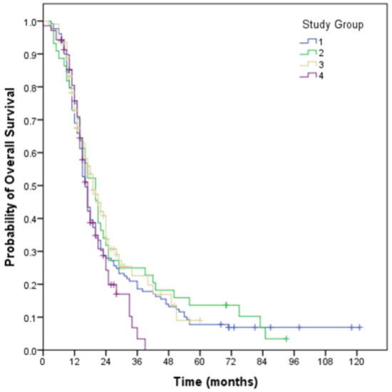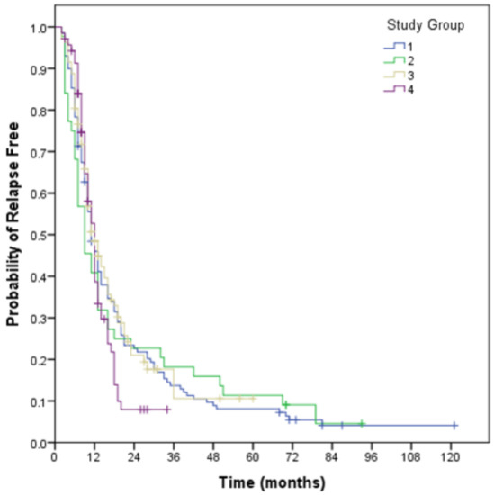 No significance difference overall survival for Groups 1 to 4 with median survivals of 16, 20, 19, and 17 months respectively (p = 0.35). Survival curves for both relapse free survival and overall survival for the Groups are demonstrated in Figure 1 and Figure 2.