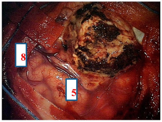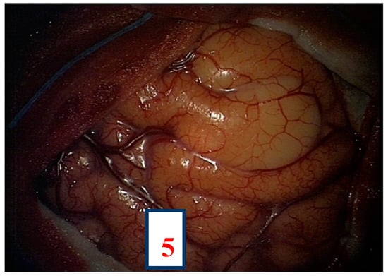 All these intraoperative functional evaluations are adopted together in different settings to perform motor, language, and visuospatial mapping according to the tumour location and to the functional anatomy of the brain []. It has been shown that the risk of post-operative motor or language deficits is 72.8% when the resection is kept 5 mm far from eloquent cortical areas and 65.4% when the resection is pushed to the boundaries of subcortical functional tract; if no subcortical tract is evidenced during the resection by brain mapping techniques, the risk of post-operative deficit is 3–5%. Even if post-operative deficits are transient and most of them disappear within 1 month, a 3.8% risk of permanent deficit has been shown in cases of subcortical resection involving functional tracts []. Usually, resection is continued until subcortical structures are found, then it has to be stopped in order to avoid neurological injury. In our daily practice, autologous fibrin glue and haemostatic agents are adopted to ensure a safer resection, limiting the risk of post-surgical bleeding within the surgical field and favouring also dural sealing [,,,]. When tumour resection is performed according to these techniques, the risk of postoperative long-term neurological impairment is very low. It has been shown that almost all patients return to work 1 month after the surgery [].